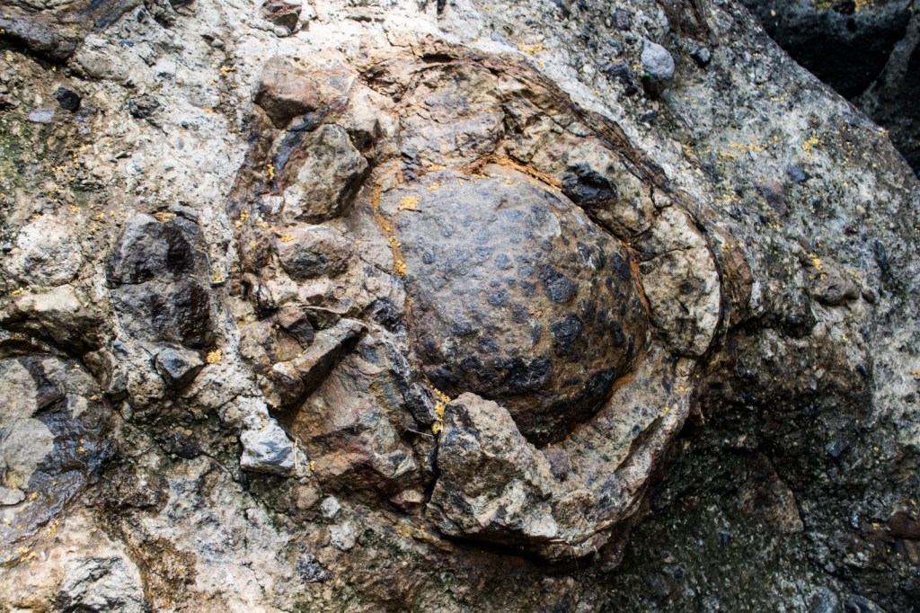 Al centro de la fotografía podrás ver esta extraña esfera dentro de una roca grande del río la cual suponemos que es un meteorito o una bala volcánica